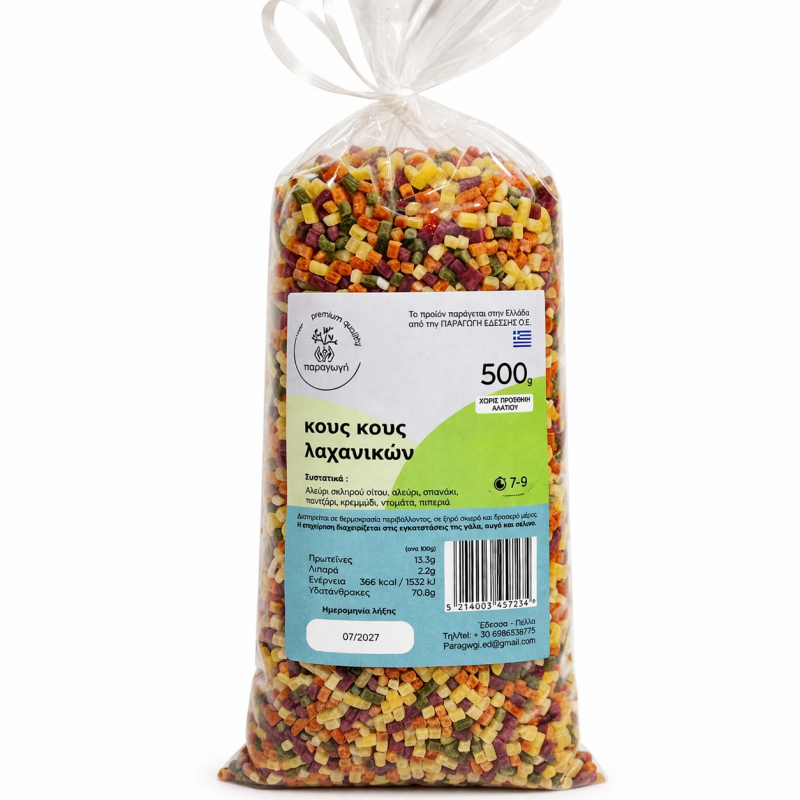 Ένα ιδιαίτερο και πολύχρωμο ζυμαρικό που συνδυάζει γεύση, ποιότητα και δημιουργικότητα σε κάθε πιάτο. Το κους κους λαχανικών είναι μια ξεχωριστή επιλογή ελληνικής παραγωγής, ιδανική για όσους θέλουν να δώσουν χρώμα και γευστική ένταση στις καθημερινές τους συνταγές. Η μοναδική του εμφάνιση με μικρούς πολύχρωμους κόκκους το καθιστά όχι μόνο νόστιμο αλλά και εντυπωσιακό στο σερβίρισμα. Συστατικά : αλεύρι σκληρού σίτου, αλεύρι, σπανάκι, παντζάρι, κρεμμύδι, ντομάτα, πιπεριά. Ο συνδυασμός των λαχανικών προσφέρει φυσικό χρώμα και διακριτική γεύση, δημιουργώντας ένα προϊόν που ξεχωρίζει για την ποιότητα και την ισορροπία του. Είναι ιδανικό για: σαλάτες ζυμαρικών, συνοδευτικά πιάτων, ελαφριά γεύματα