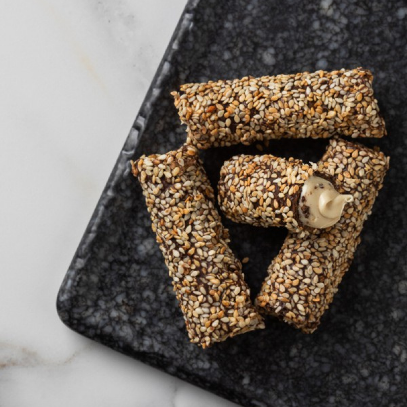 Πουράκια μαρκαλάτο με θαυμάσια επικάλυψη σουσαμιού και απαλή γέμιση κρέμας ταχίνι. Αυτό το σκανδαλιάρικο φίνο ρολάκι, τραγανό απ’ έξω, βελούδινο από μέσα αποτελεί ιδανική επιλογή για κέρασμα σε γιορτές, γενέθλια και εκδηλώσεις. Η τιμή του κιλού περιέχει 25 τεμάχια. Να διατηρείται σε δροσερό και ξηρό μέρος.
