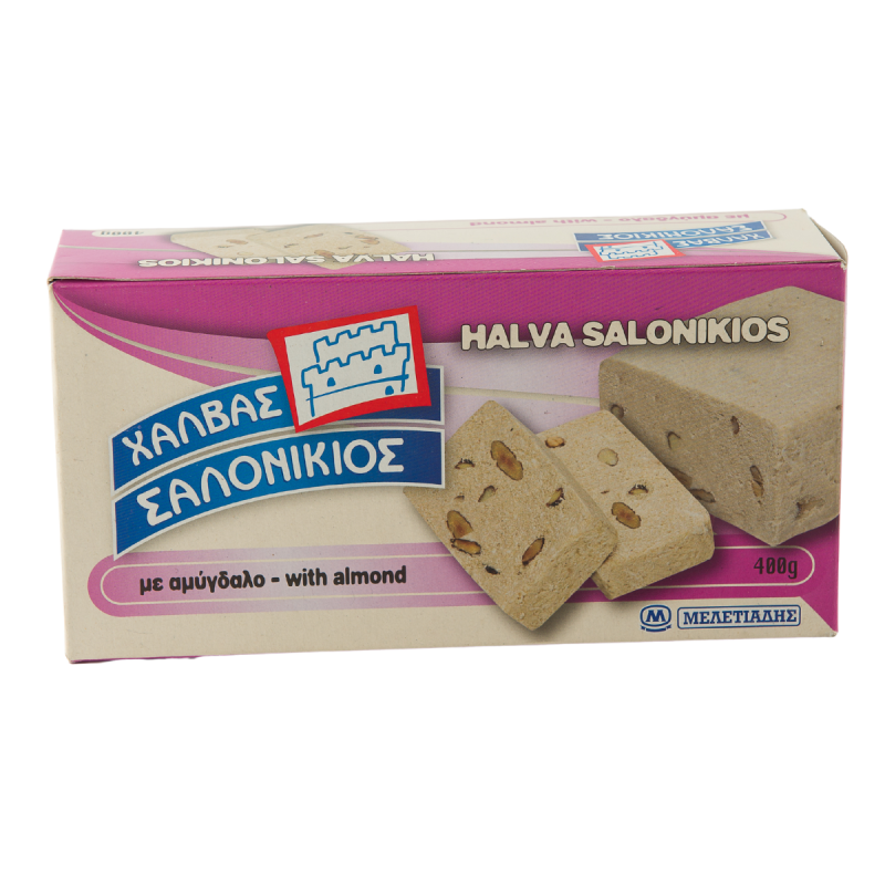 Παραδοσιακός και κλασσικός χαλβάς με αμύγδαλο από την εταιρεία Μελετιάδη. Ιδανική επιλογή για την περίοδο της νηστείας αλλά και γενικότερα. Τα συστατικά Ταχίνι (αλεσμένο αποφλοιωμένο σησάμι), σιρόπι γλυκόζης, αμύγδαλο 6%, ζάχαρη, μερικώς υδρογονωμένα φυτικά έλαια (φοινικέλαιο), εκχύλισμα τσουενιού, αρωματική ύλη: βανιλλίνη.