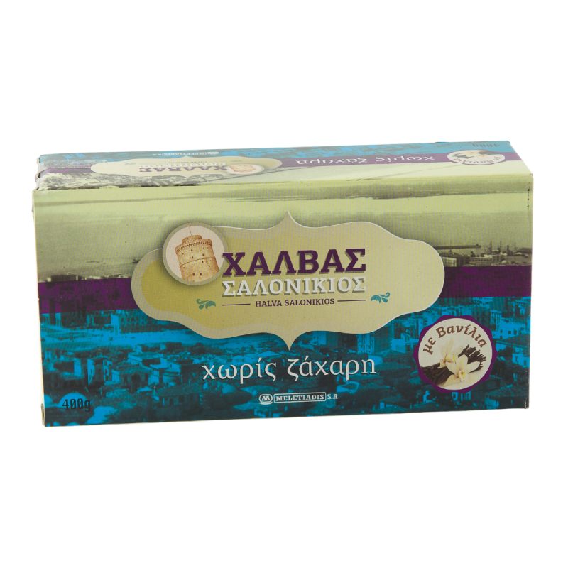 Παραδοσιακός και κλασσικός χαλβάς χωρίς ζάχαρη με γεύση βανίλια από την εταιρεία Μελετιάδη. Γι' αυτούς που αγαπούν το χαλβά αλλά δεν θέλουν θερμίδες. Ιδανική επιλογή για την περίοδο της νηστείας αλλά και γενικότερα. Ταχίνι (αλεσμένο αποφλοιωμένο σησάμι), σιρόπι μαλτιτόλης, γλυκαντικό: ισομαλτιτόλη, μερικώς υδρογονωμένα φυτικά έλαια (φοινικέλαιο), εκχύλισμα τσουενιού, αρωματική ύλη: βανιλλίνη.