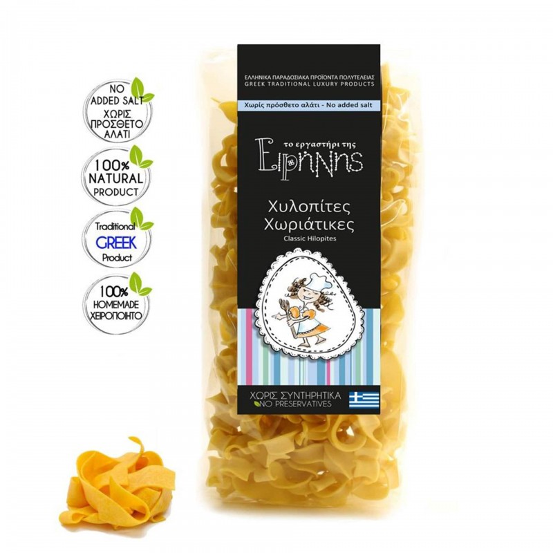 Χειροποίητα αγνά ζυμαρικά από εκλεκτά Ελληνικά σιτάρια γεμάτα φρεσκάδα και απόλαυση. Βραβευμένες από τον μεγαλύτερο διαγωνισμό γευσιγνωσίας στον κόσμο. Το Great Taste Awards.Χυλοπίτες χωριάτικες ζυμωμένες με φρέσκα αυγά και φρέσκο γάλα που ξαποσταίνουν επάνω σε λευκά σεντόνια. Μυρωδιές από το χωριό και μνήμες που ζωντανεύουν ξανά και ξανά μέσα από ένα κλασικά αγαπημένο ζυμαρικό που όλοι έχουμε αγαπήσει. Ταιριάζουν απίστευτα με τριμμένη φέτα, σάλτσα φέτας, γιαούρτι ή φρέσκια ντομάτα. Κάθε συσκευασία περιέχει 400g/ 4+ μερίδες και ο χρόνος βρασμού: 3'-4' σε νερό που βράζει.